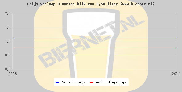 De gemiddelde prijs van een blik van 0,50 liter van 3 Horses is niet bekend. De gemiddelde prijs van 3 Horses in de winkel is niet bekend.