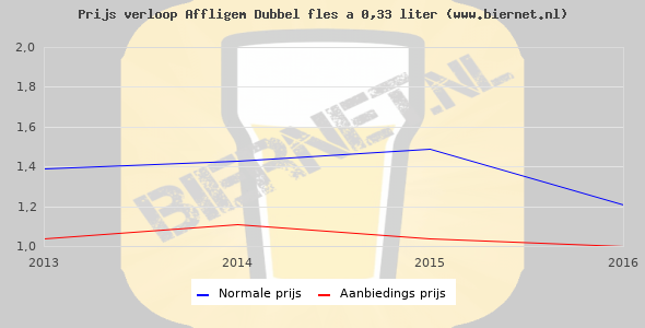 De gemiddelde prijs van een fles á 0,33 liter van Affligem Dubbel is niet bekend. De gemiddelde prijs van Affligem Dubbel in de winkel is niet bekend.