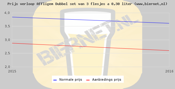 De gemiddelde prijs van een set van 3 flesjes á 0,30 liter van Affligem Dubbel is niet bekend. De gemiddelde prijs van Affligem Dubbel in de winkel is niet bekend.