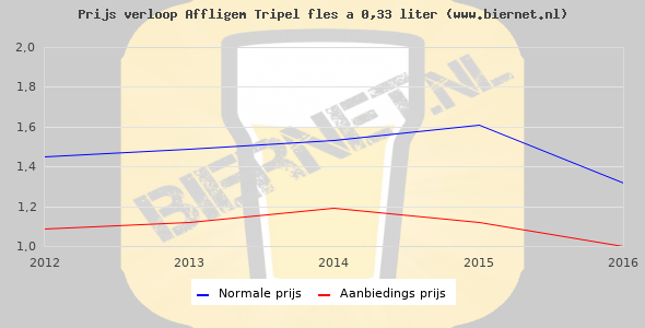 De gemiddelde prijs van een fles á 0,30 liter van Affligem Tripel is €1,66 (€5,53 per liter). De gemiddelde prijs van Affligem Tripel in de winkel is €5,12 per liter.