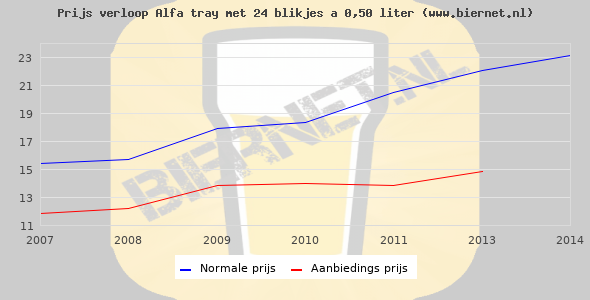 De gemiddelde prijs van een tray met 24 blikjes 0,50 liter van Alfa Edel Pils is niet bekend. De gemiddelde prijs van Alfa Edel Pils in de winkel is niet bekend.