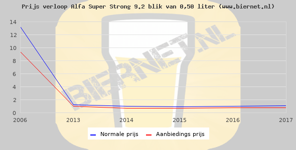 De gemiddelde prijs van een blik van 0,50 liter van Alfa Super Strong 9.2 is €1,88 (€3,76 per liter). De gemiddelde prijs van Alfa Super Strong 9.2 in de winkel is €3,76 per liter.