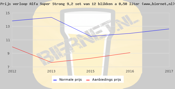 De gemiddelde prijs van een set van 12 blikken á 0,50 liter van Alfa Super Strong 9.2 is niet bekend. De gemiddelde prijs van Alfa Super Strong 9.2 in de winkel is niet bekend.