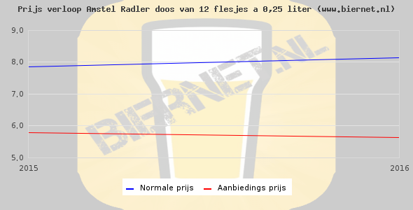 De gemiddelde prijs van een doos van 12 flesjes 0,25 liter van Amstel Radler is niet bekend. De gemiddelde prijs van Amstel Radler in de winkel is niet bekend.