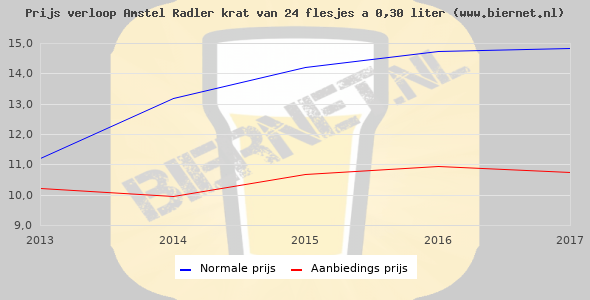 De gemiddelde prijs van een krat van 24 flesjes á 0,30 liter van Amstel Radler is €24,14 (€3,35 per liter). De gemiddelde prijs van Amstel Radler in de winkel is €3,26 per liter.