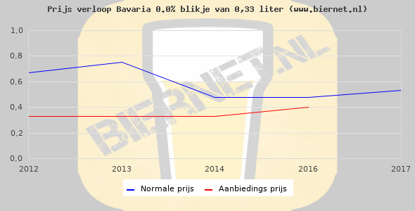De gemiddelde prijs van een blikje van 0,33 liter van Bavaria 0.0% is €0,92 (€2,79 per liter). De gemiddelde prijs van Bavaria 0.0% in de winkel is €2,85 per liter.