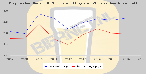 De gemiddelde prijs van een set van 6 flesjes á 0,30 liter van Bavaria 0.0% is €4,99 (€2,77 per liter). De gemiddelde prijs van Bavaria 0.0% in de winkel is €2,85 per liter.