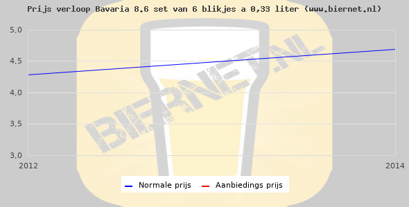 De gemiddelde prijs van een set van 6 blikjes 0,33 liter van Bavaria 8.6 Original is niet bekend. De gemiddelde prijs van Bavaria 8.6 Original in de winkel is niet bekend.