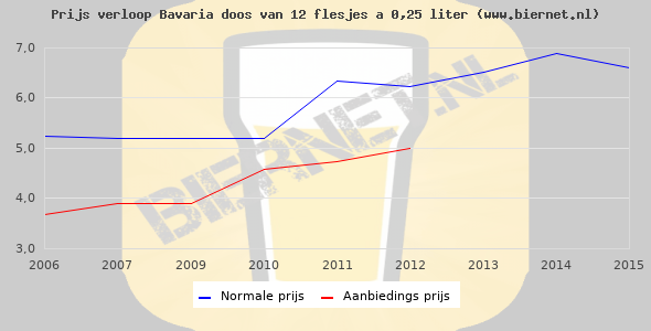 De gemiddelde prijs van een doos van 12 flesjes 0,25 liter van Bavaria Pilsener is niet bekend. De gemiddelde prijs van Bavaria Pilsener in de winkel is niet bekend.