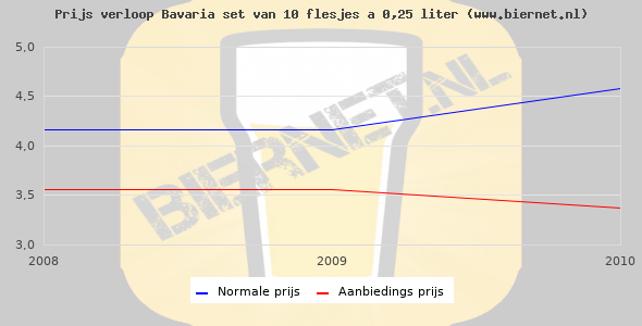 De gemiddelde prijs van een set van 10 flesjes á 0,25 liter van Bavaria Pilsener is niet bekend. De gemiddelde prijs van Bavaria Pilsener in de winkel is niet bekend.