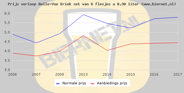 De gemiddelde prijs van een set van 6 flesjes á 0,30 liter van Belle-Vue Kriek is niet bekend. De gemiddelde prijs van Belle-Vue Kriek in de winkel is niet bekend.