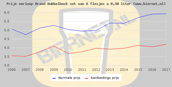 Hieronder staan de standaard prijzen van een Brand Dubbelbock set van 6 flesjes á 0,30 liter. Op dit moment zijn er geen aanbiedingen bekend van Brand Dubbelbock.