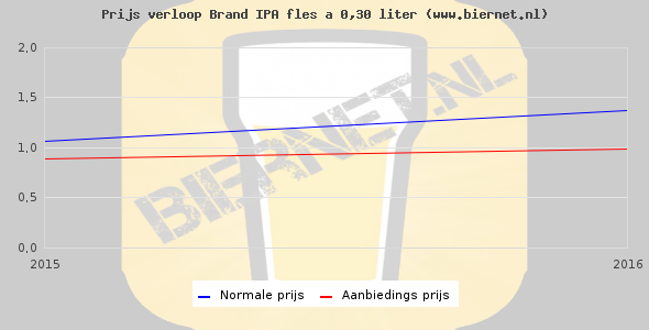 De gemiddelde prijs van een fles á 0,30 liter van Brand IPA is €1,53 (€5,1 per liter). De gemiddelde prijs van Brand IPA in de winkel is €4,98 per liter.
