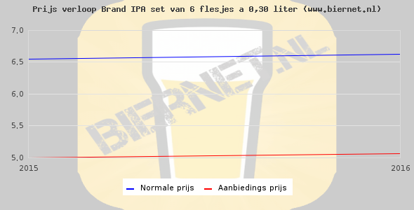 De gemiddelde prijs van een set van 6 flesjes á 0,30 liter van Brand IPA is €8,94 (€4,97 per liter). De gemiddelde prijs van Brand IPA in de winkel is €4,98 per liter.