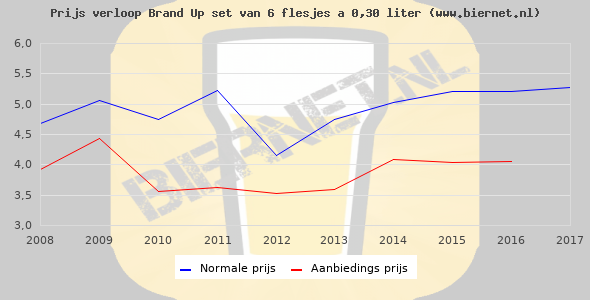 De gemiddelde prijs van een set van 6 flesjes á 0,30 liter van Brand Up is niet bekend. De gemiddelde prijs van Brand Up in de winkel is niet bekend.