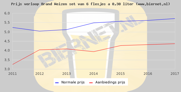 De gemiddelde prijs van een set van 6 flesjes á 0,30 liter van Brand Weizen is €7,49 (€4,16 per liter). De gemiddelde prijs van Brand Weizen in de winkel is €4,19 per liter.