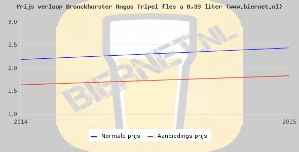 De gemiddelde prijs van een fles á 0,33 liter van Bronckhorster Angus Tripel is niet bekend. De gemiddelde prijs van Bronckhorster Angus Tripel in de winkel is niet bekend.