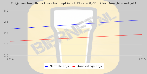De gemiddelde prijs van een fles á 0,33 liter van Bronckhorster Hoptimist is niet bekend. De gemiddelde prijs van Bronckhorster Hoptimist in de winkel is niet bekend.