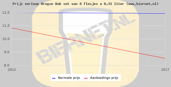 De gemiddelde prijs van een set van 8 flesjes á 0,33 liter van Brugse Bok is niet bekend. De gemiddelde prijs van Brugse Bok in de winkel is niet bekend.
