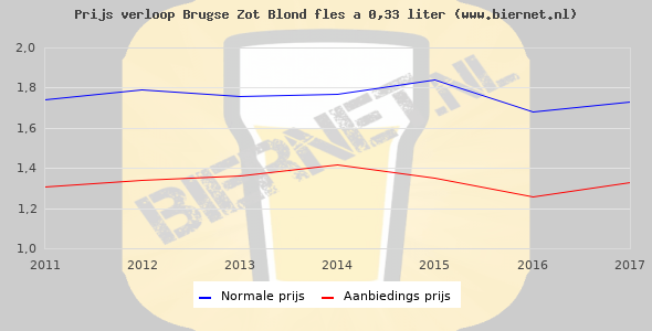 De gemiddelde prijs van een fles á 0,33 liter van Brugse Zot Blond is €2,43 (€7,36 per liter). De gemiddelde prijs van Brugse Zot Blond in de winkel is €7,77 per liter.