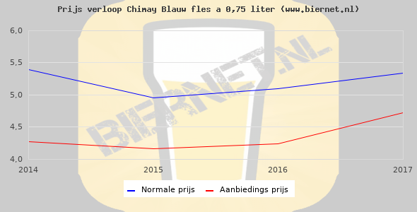De gemiddelde prijs van een fles á 0,75 liter van Chimay Blauw is €7,78 (€10,37 per liter). De gemiddelde prijs van Chimay Blauw in de winkel is €9,46 per liter.