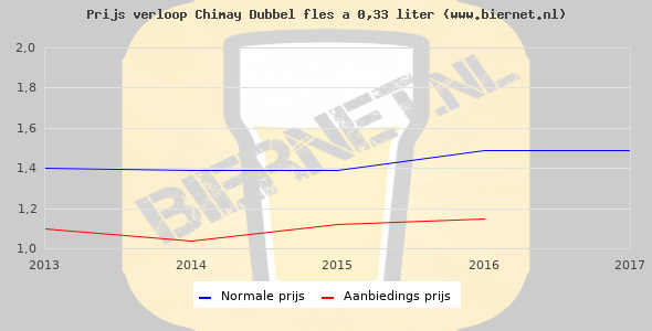 De gemiddelde prijs van een fles á 0,33 liter van Chimay Rood is €2,35 (€7,12 per liter). De gemiddelde prijs van Chimay Rood in de winkel is €7,34 per liter.