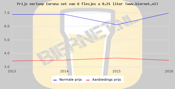 De gemiddelde prijs van een set van 6 flesjes á 0,21 liter van Corona is niet bekend. De gemiddelde prijs van Corona in de winkel is niet bekend.