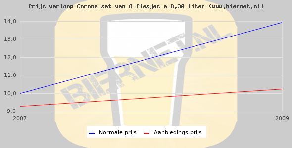 De gemiddelde prijs van een set van 8 flesjes á 0,30 liter van Corona is niet bekend. De gemiddelde prijs van Corona in de winkel is niet bekend.