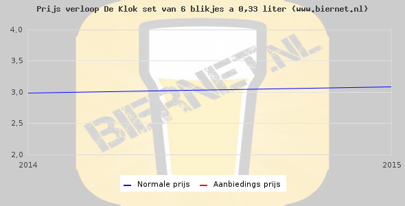 De gemiddelde prijs van een set van 6 blikjes 0,33 liter van De Klok Pilsner is €4,12 (€2,08 per liter). De gemiddelde prijs van De Klok Pilsner in de winkel is €1,93 per liter.