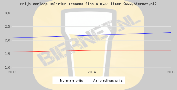 De gemiddelde prijs van een fles á 0,33 liter van Delirium Tremens is €2,82 (€8,55 per liter). De gemiddelde prijs van Delirium Tremens in de winkel is €12,14 per liter.