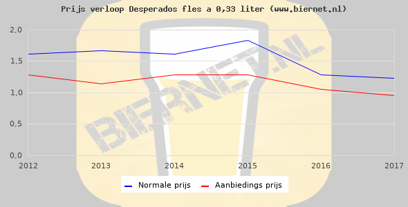 De gemiddelde prijs van een fles á 0,33 liter van Desperados Original is €1,82 (€5,52 per liter). De gemiddelde prijs van Desperados Original in de winkel is €5,04 per liter.