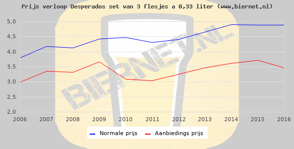 De gemiddelde prijs van een set van 3 flesjes á 0,33 liter van Desperados Original is niet bekend. De gemiddelde prijs van Desperados Original in de winkel is niet bekend.