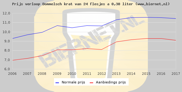 De gemiddelde prijs van een krat van 24 flesjes á 0,30 liter van Dommelsch Pilsener is €16,59 (€2,3 per liter). De gemiddelde prijs van Dommelsch Pilsener in de winkel is €2,61 per liter.
