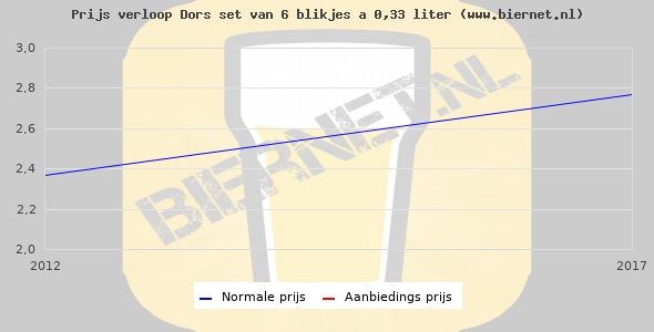 De gemiddelde prijs van een set van 6 blikjes 0,33 liter van Dors Premium Pilsener is €2,99 (€1,51 per liter). De gemiddelde prijs van Dors Premium Pilsener in de winkel is €1,32 per liter.