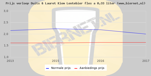 De gemiddelde prijs van een fles á 0,33 liter van Duits & Lauret Kiem Lentebier is niet bekend. De gemiddelde prijs van Duits & Lauret Kiem Lentebier in de winkel is niet bekend.
