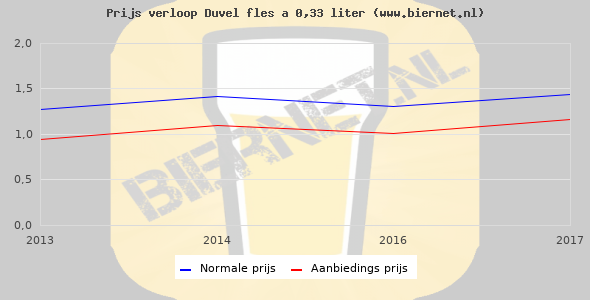 De gemiddelde prijs van een fles á 0,33 liter van Duvel is €2,38 (€7,21 per liter). De gemiddelde prijs van Duvel in de winkel is €6,64 per liter.