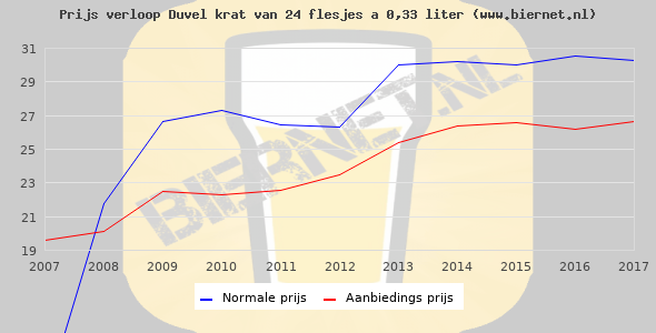 De gemiddelde prijs van een krat van 24 flesjes á 0,33 liter van Duvel is €49,55 (€6,26 per liter). De gemiddelde prijs van Duvel in de winkel is €6,64 per liter.