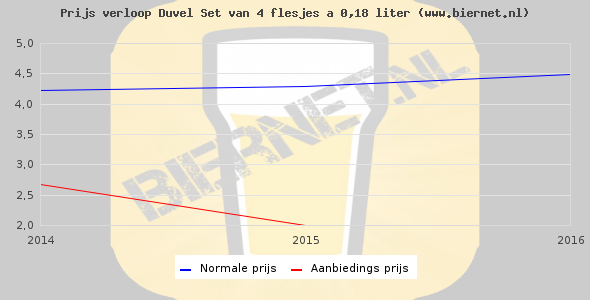 De gemiddelde prijs van een set van 4 flesjes á 0,18 liter van Duvel is niet bekend. De gemiddelde prijs van Duvel in de winkel is niet bekend.