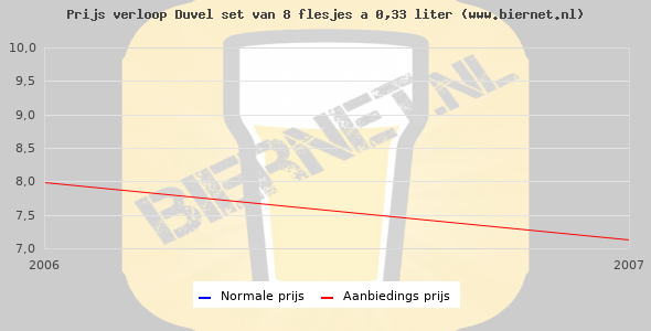 De gemiddelde prijs van een set van 8 flesjes á 0,33 liter van Duvel is niet bekend. De gemiddelde prijs van Duvel in de winkel is niet bekend.