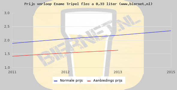 De gemiddelde prijs van een fles á 0,33 liter van Ename Tripel is €2,8 (€8,48 per liter). De gemiddelde prijs van Ename Tripel in de winkel is €8,48 per liter.