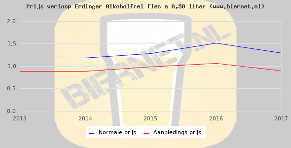 De gemiddelde prijs van een fles á 0,50 liter van Erdinger Alkoholfrei is €1,99 (€3,98 per liter). De gemiddelde prijs van Erdinger Alkoholfrei in de winkel is €4,12 per liter.