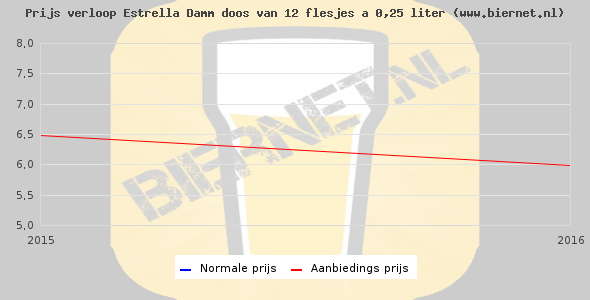 De gemiddelde prijs van een doos van 12 flesjes 0,25 liter van Estrella Damm is niet bekend. De gemiddelde prijs van Estrella Damm in de winkel is niet bekend.