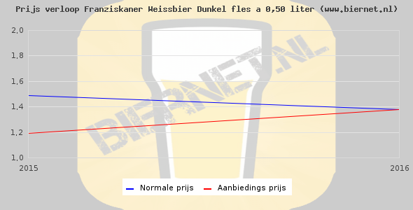 De gemiddelde prijs van een fles á 0,50 liter van Franziskaner Weissbier Dunkel is niet bekend. De gemiddelde prijs van Franziskaner Weissbier Dunkel in de winkel is niet bekend.