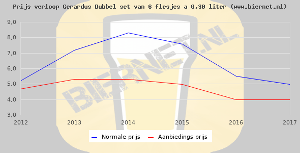 De gemiddelde prijs van een set van 6 flesjes á 0,30 liter van Gerardus Dubbel is €5,99 (€3,33 per liter). De gemiddelde prijs van Gerardus Dubbel in de winkel is €3,33 per liter.