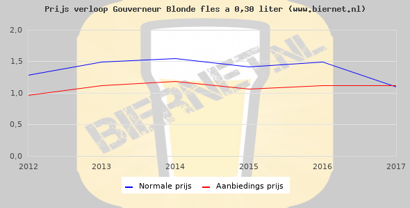 De gemiddelde prijs van een fles á 0,30 liter van Gouverneur Blond is €2,32 (€7,73 per liter). De gemiddelde prijs van Gouverneur Blond in de winkel is €9,10 per liter.