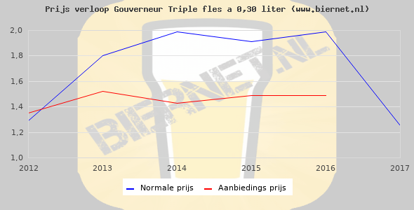 De gemiddelde prijs van een fles á 0,30 liter van Gouverneur Tripel is €2,65 (€8,83 per liter). De gemiddelde prijs van Gouverneur Tripel in de winkel is €10,40 per liter.