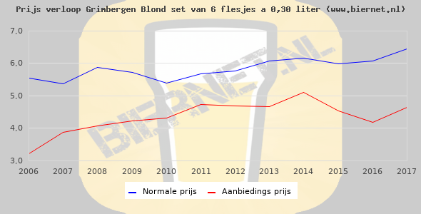 De gemiddelde prijs van een set van 6 flesjes á 0,30 liter van Grimbergen Blond is €7,64 (€4,24 per liter). De gemiddelde prijs van Grimbergen Blond in de winkel is €4,15 per liter.
