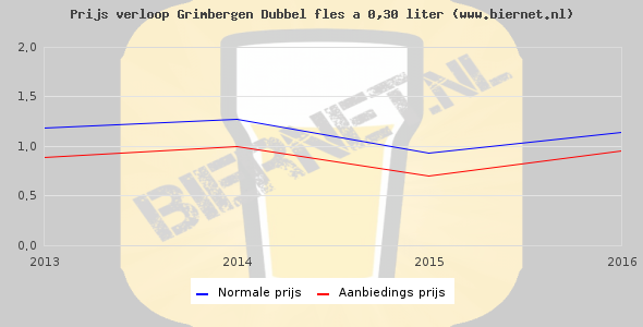 De gemiddelde prijs van een fles á 0,30 liter van Grimbergen Dubbel is €1,45 (€4,83 per liter). De gemiddelde prijs van Grimbergen Dubbel in de winkel is €4,31 per liter.