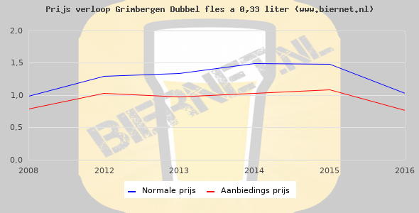 De gemiddelde prijs van een fles á 0,33 liter van Grimbergen Dubbel is niet bekend. De gemiddelde prijs van Grimbergen Dubbel in de winkel is niet bekend.