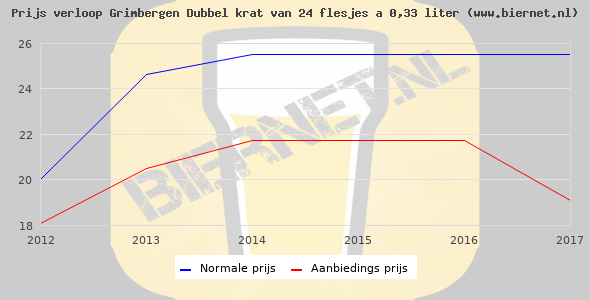 De gemiddelde prijs van een krat van 24 flesjes á 0,33 liter van Grimbergen Dubbel is niet bekend. De gemiddelde prijs van Grimbergen Dubbel in de winkel is niet bekend.